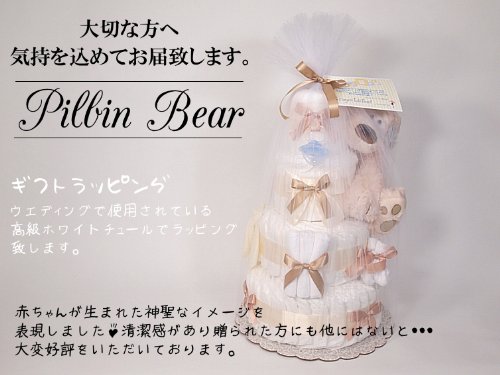 4段おむつケーキ「フィリビンホワイトテディ」【出産祝い】x【パンパース使用】Sサイズ(4~8kg), 女の子