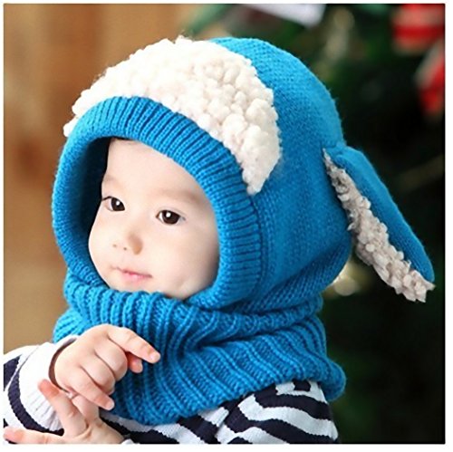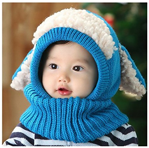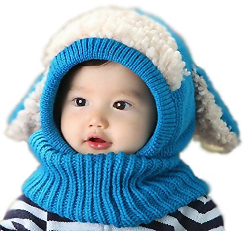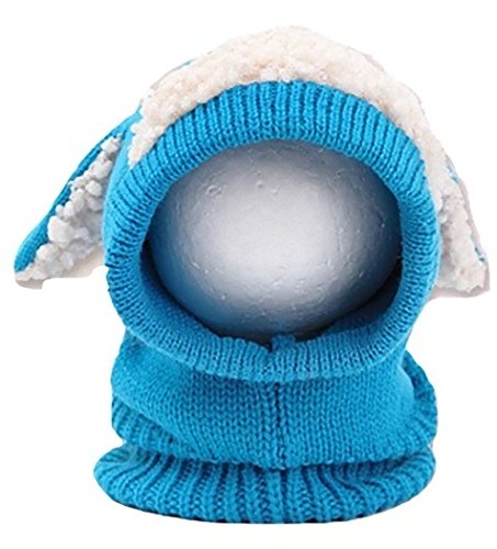 子供用 もふもふ ひつじ ニット帽 ネックウォーマー 防寒 アニマルフード 男の子 女の子 兼用 (ブルー)