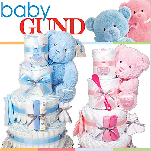 ★GUND baby★大きなテディの豪華4段おむつケーキ! 当店人気のオムツケーキ♪ふわふわの肌触り! (Lサイズ47枚(目安9~15ヶ月), ピンク)