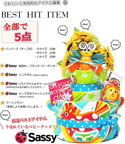 大人気のSassyおむつケーキ! ママから人気のサッシーのベビーグッズで装飾しました。 サッシーの実用的なタオル等、大変喜ばれております。 紙おむつ(パンパース)の枚数が多く、かわいいと評判の出産祝いギフト! 当店のダイパーケーキデザイナー自慢の作りの綺麗さは先方様にも喜んでいただけます。相手の好み等気にせずに贈れるオムツケーキギフトです。 ■付属品 ・パンパースおむつ・Sassy歯固め(フラッタービーティサー) ・Sassyミニタオル(25cm×25cm) ・Sassyリストラトル&チャームバンド ・Sassyループ付きウォッシュタオル(34cm×34cm) ・アートフラワー(季節により変更いたします。) ・サテンリボン・カード・ケーキトレー ■商品サイズ ・タテ35cm×ヨ23cm 撮影時には商品の色をできるだけ忠実に表現できるよう努めておりますが、お使いのモニターの状況などにより、実際の色とは異なって見えることがございます。付属品のベビーアイテム、リボンは仕入れの状況に色等が変わる場合がございます。ご了承ください。 この商品は、衛生上返品、交換を承れません