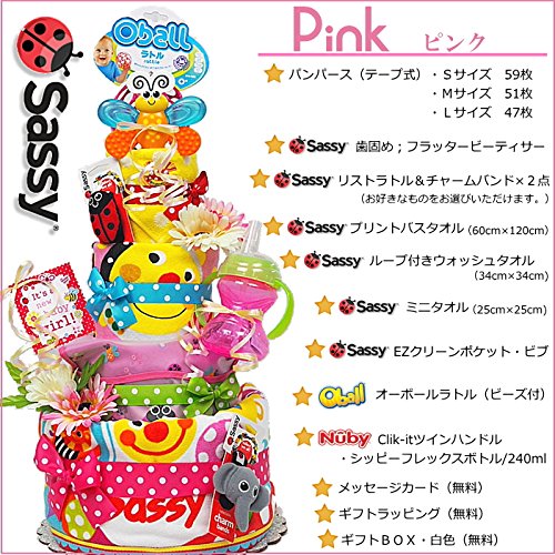 デラックス4段おむつケーキ/SASSy10点/出産祝い/ベビーギフト♪出産祝い 男の子 女の子 ベビーギフト!Sassyサッシー (Sサイズ59枚(目安2~5ヶ月前後), ピンク)