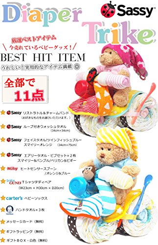 ハンドルのグリップにはH&Mのベビーソックス。 ヘットライト部分にはオランダで一番売れているディフラックスの使いやすい新素材哺乳瓶。 パパ、ママには授乳時の負担を軽減し、ベビーには母乳を飲むときと同じような安心感、心地良さを実現しました。 最先端の安心素材「トライタン」親と赤ちゃんをリラックスさせます。 マフラーはマンチキンの離乳食用のファーストスプーン。 前輪のカールとシート部分には大人気のカーターズのかわいいススタイ。ハンドルとタイヤの連結にはふわふわのフェイスタオル。 タイヤのホイールにはガーバーの赤ちゃんに優しい肌触りの良いハンドタオル。タイヤはパンパースを使用。 かなりクオリティーの高い出産祝いギフトです。赤ちゃんにとって実用的なアイテムが全て揃った出産祝いギフトになっております。 ■付属品 ・パンパースおむつ・ぬいぐるみ(ガンドベビー) ・哺乳瓶250cc(ディフラックス)・スタイ2枚(Sassy) ・Sassyフェイスタオル・Sassyループ付きウォッシュタオル ・Sassyチャームバンド・ベビーソックス(carters) ・ハンドタオル3枚(ガーバー)・ファーストスプーン(Nuby) ・サテンリボン ■商品サイズ タテ33cm×ヨコ30cm×高さ40cm 撮影時には商品の色をできるだけ忠実に表現できるよう努めておりますが、お使いのモニターの状況などにより、実際の色とは異なって見えることがございます。おむつケーキのリボン又、付属品のベビーアイテムは仕入れの状況により色等が変わる場合がございますのでご了承ください。 この商品は衛生上返品、交換を承れません。
