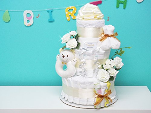 3段おむつケーキ パンパース40枚(Sサイズ) 付属品 オーガニックベアーラトル ベビーソックス ガーゼタオル×3 小バラピック