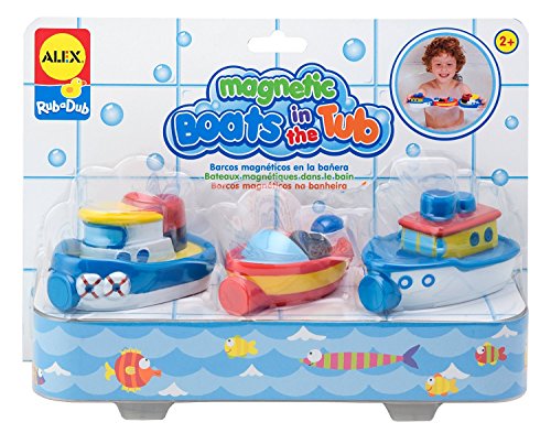 ALEX Toys Rub a Dub Magnetic Boats in the Tub includes 3 soft vinyl boats that have magnetic connectors to dock them together. It comes with a tugboat, fishing boat and speedboat. Compatible with other magnetic tub toys, so you can link your boats to ducks or monsters! Recommended for children 2 years of age and older.