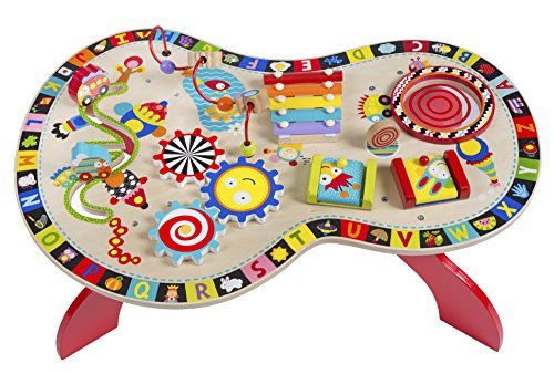 ALEX Jr. Sound and Play Busy Table keeps up to 3 little ones entertained at once! This busy table's whimsical, model design makes it a beautiful addition to any playroom. Pound, slide peek, explore and make music! Includes a table with 6 fun activities such as a xylophone, drum, peek-a-boo doors, spinning gears, curvy bead maze, track sliders and a wooden mallet. Measures 26.5in. long x 18in. wide x 7.75in. high. Recommended for children 18 months of age and older.