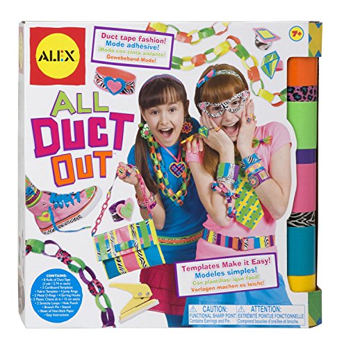 ALEX Toys DIY Wear All Duct Out lets you just tear, stick and wear! Make belts, jewelry, headbands, glasses, a purse and more. Templates and stencils make it easy! Includes 8 rolls of duct tape, 3 templates, precut fabric, 4 earring hooks, 4 jump rings, brooch pin, 2 belt rings, 2 plastic chains, hole punch, stencil, 2 stretchy loops, non-stick paper and easy instructions. Includes 8 rolls of duct tape, templates, fabric, earring hooks, jump rings, brooch, belt rings, plastic chains, hole punch, stencil and instructions. Recommended for children 7 years of age and older.