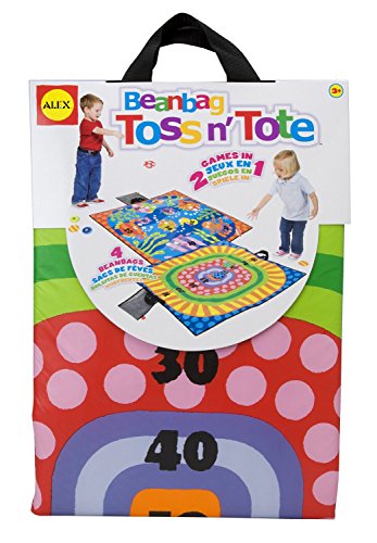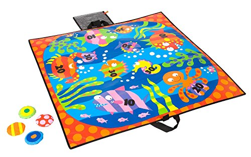 Two beanbag toss games in one easy to travel tote| The large 36' x 36' mat features a bullseye target printed on one side, with points for each ring of the target your little ones hits. Flip the mat over and a Feed the Fish game features different sea creatures. Your little one will learn to recognize numbers, perform addition, and develop their hand-eye coordination skills. Included are four colorful beanbags. When playtime is over, just fold up the mat and place it in the zippered mesh bag for easy storage.