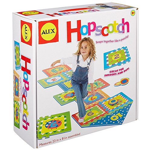 ALEX Toys Active Play Hopscotch includes a big, bright and colorful 23 inch wide by 81 inch long foam hopscotch board. Your little ones will be hopping and jumping on this board that can be set up both indoors and out. The set snaps together like a puzzle and stores easily in a carry-along bag! Includes 10 number tiles and 4 place markers. Recommended for children 3 years of age and older.