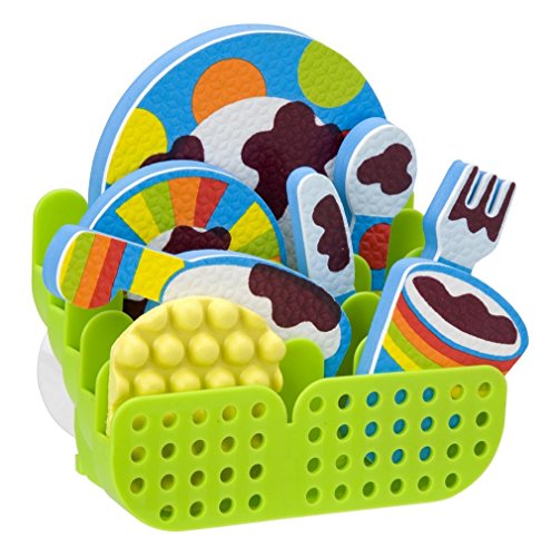 Clean your dishes in the tub! Dip the dishes in warm water and watch the dirt disappear! 12 piece set that includes a dish rack that suction cups to the wall and a sponge