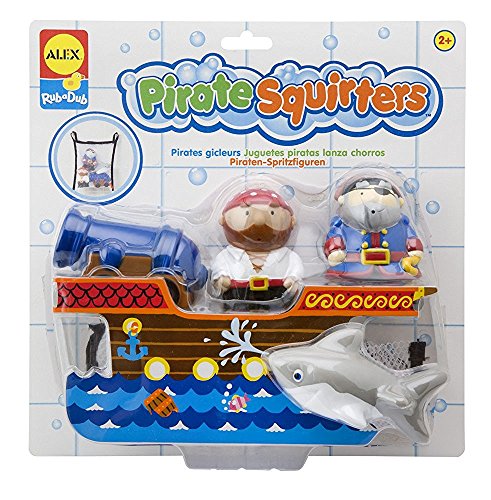 Includes 2 pirates, shark, cannon, and treasure chest squirters. Packaged in a reusable mesh bag for storage and drying. From the Manufacturer Set includes 4 squirters,: 2 pirates, a shark and a cannon. Also includes mesh bag with suction cups for drying and storage. Phthalate-free. Baby and toddler safe. Ages 6 months and up.