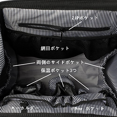 - 【ポケット】:内側:①層には内面仕切りポケットが12カ所ある(保温ポケット3ヵ所)。②層には仕切りポケットが2ヵ所装備されている。外側:フロントZIPポケット、両側のサイドポケット(1ヵ所はティッシュ入れためのファスナー付きポケットが装備されている)、背中の後ろに隠れるZIPポケット