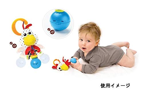 - 型のラトル。 陽気な音楽や動物の鳴き声がするラトルです。にわとり「こっこ」のとさかや首飾りは触れると赤ちゃんの大好きなパリパリ音が鳴り、胴体あたりではカラフルなリングがシャカシャカと音を鳴らします。持ち手のボール部分のスイッチを入れてラトルを振ると2種類の音楽が流れ、ふたたび振ることで音楽が切り替わります。C環が付いているので、ベビーカーやマザーズバッグに