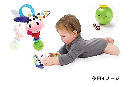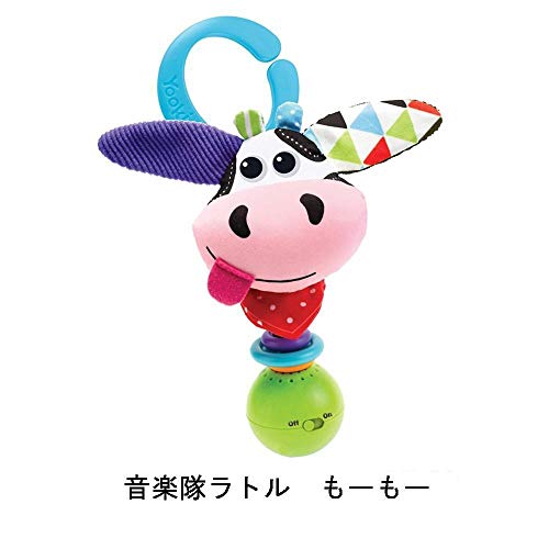 - 陽気な音楽や動物の鳴き声がするラトルです。うし「もーもー」のバンダナや耳は触れると赤ちゃんの大好きなパリパリ音がなり、胴体あたりではカラフルなリングがシャカシャカと音を鳴らします。持ち手のボール部分のスイッチをオンにすると2種類の音楽が流れ、再び振ることで音楽が切り替わります。C環が付いているので、ベビーカーやマザーズバッグに吊り下げておくことができます。