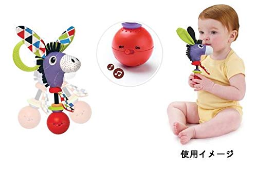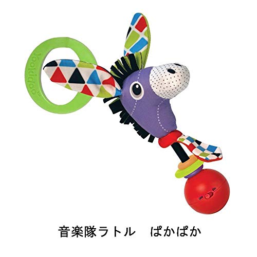 - 陽気な音楽や動物の鳴き声がするラトルです。馬の「ぱかぱか」の耳は触れると赤ちゃんの大好きなパリパリ音がなり、胴体あたりではカラフルなリングがシャカシャカと音を鳴らします。持ち手のボール部分にあるスイッチをオンにすると3種類の音楽が流れ、再び振ることで音楽が切り替わります。C環が付いているので、ベビーカーやマザーズバッグに吊り下げておくことができます。