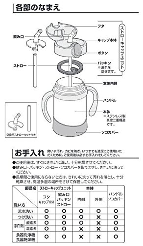 - 材質 内びん:ステンレス鋼 胴部:ステンレス鋼(アクリル樹脂塗装) フタ・キャップ本体・ハンドル:ポリプロピレン 飲み口・ストロー・パッキン・ソコカバー:シリコーン 仕様 実容量:250ml 対象年齢:9ヶ月頃~ 丸洗いOK 保冷専用 保冷効力(6時間):13度以下 付属品 スペアストローセット 取扱説明書 製造国 フィリピン