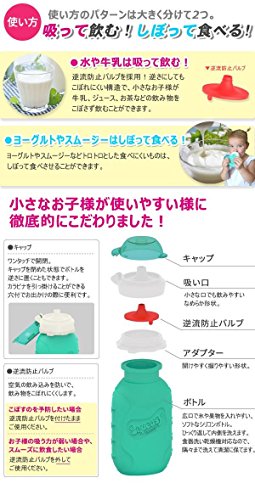 お子様に飲み物やピューレ状の食べ物を与えるためのボトル ヨーグルト、ピューレ、スムージーなどトロトロとした食べにくいものや、こぼして欲しくない牛乳などを汚さず飲ませたり、食べさせたりできる画期的なボトルです。 サイズ (約)上部幅:6.5cm、下部幅:7.5cm、高さ:14.5cm 個装サイズ:8×7×15cm 重量 75g 個装重量:75g 素材・材質 ボトル・逆流防止バルブ:シリコーン キャップ・吸い口・アダプター:ポ