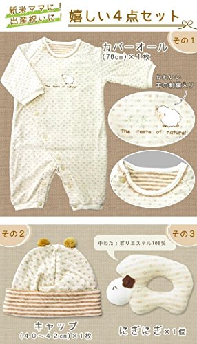 新米ママに 出産祝いに うれしい4点セット。 カリフォルニア産オーガニックコットン100%素材で組んだギフトセットです。 サイズ 個装サイズ:30×23×10cm 重量 個装重量:400g 素材・材質 オーガニック素材/綿100%(カリフォルニア産オーガニックコットン) セット内容 カバーオール70cm×1枚 キャップ40~42cm×1枚 ひつじラトル(にぎにぎ)×1個 紙おむつ×8枚 製造国 日本