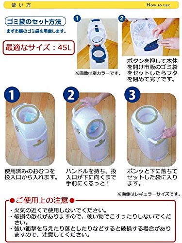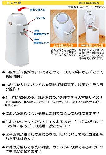 - 73cm 個装サイズ:31×42×38cm 重量 個装重量:4800g 素材・材質 ポリプロピレン、ABS樹脂 仕様 組立品 最適袋サイズ:45L(Sサイズおむつ約50枚) 付属品 取扱説明書 製造国 中国(企画:オランダ) ポンッと入れてくるっと回すだけのおむつ処理容器!! ※商