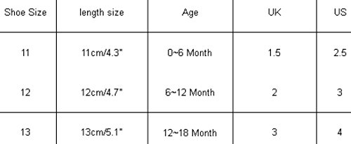 サイズ詳細は、以下のとおりです。靴のサイズ11長さサイズ: 1 1 cm / 4.3 "年齢0 ~ 6 Month UK1.5 US2.5靴のサイズ: 12長さサイズ: 12 cm / 4.7 "年齢6 ~ 12 month UK2 US3靴のサイズ: 13長さサイズ: 13 cm / 5.1 "年齢12 ~ 18 month UK3 US4