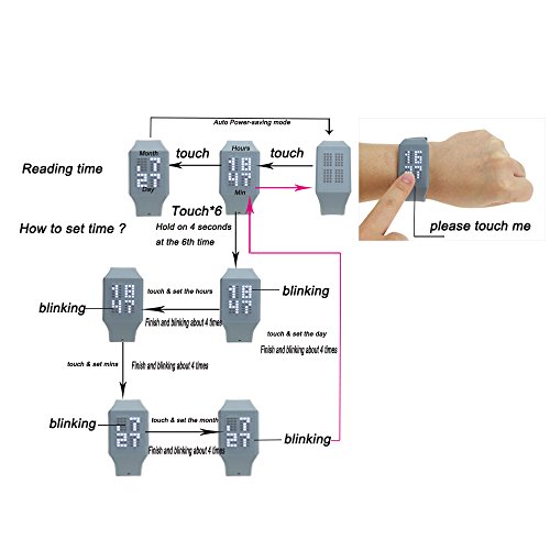 腕時計の光に画面をタッチすると、画面に触れ、6回、6時間に触れることで4秒を持ちます。そしてそれはモード設定に変えてください。時間を調整するには、画面をタッチし、時間調整が終了した後、分ライトが点滅し始めます。微調整を終えた後に、月の光が点滅し始めると、日の光の点滅を開始します。5秒待って、腕時計を静止した状態に戻ります。