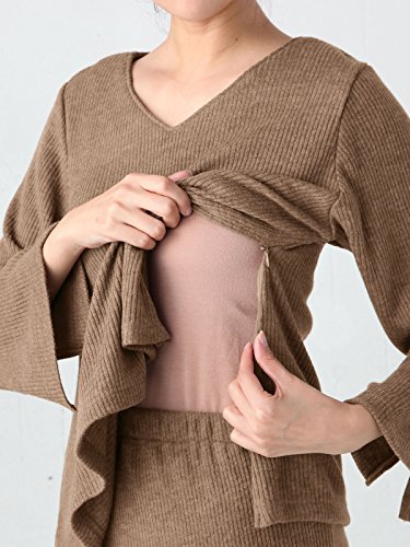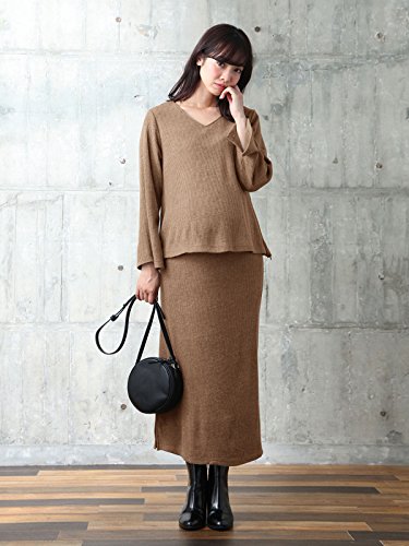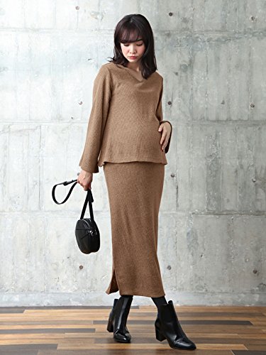 ANGELIEBE エンジェリーベ マタニティー 授乳口付き Vネック トップス & ロング タイトスカート セットアップ 妊婦服 産前 産後 長袖 S~M ベージュ 22358 22358401