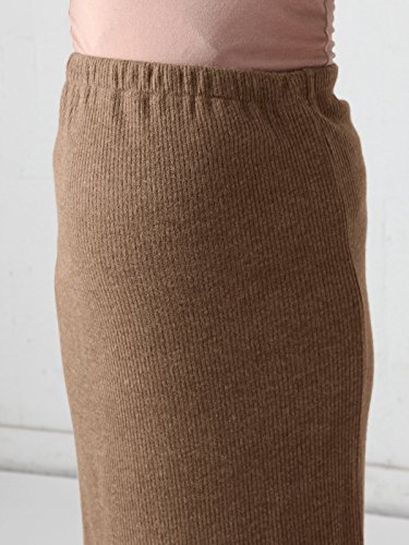 リブニットのように見えるニットソー素材で、あたたかみのある風合いに。スカートはウエストがワンタッチで調節できるアジャスターゴムの楽ちん仕様。すっきりとした大人のロング丈のタイトシルエットです。両サイドのスリットもアクセント。伸縮性のある裏地付きだから、タイツを合わせても快適です。