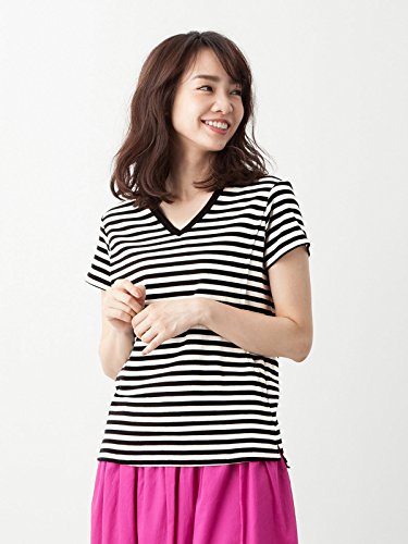ANGELIEBE エンジェリーベ マタニティ 産後 授乳服 綿混 やわらか フライス 半袖 Vネック Tシャツ 授乳ウエア トップス フリー ブラック×オフボーダー 30163500