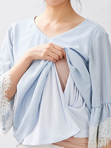 - ●【産前~産後まで使える授乳口付き防汚加工 袖レースブラウス】デザイン性が高いアイテムなので、シンプルなボトムをさらりと合わせるだけでこなれ感のあるコーディネートが完成。表地をめくるとクロスオープンの授乳口があります。通勤にもおすすめです。