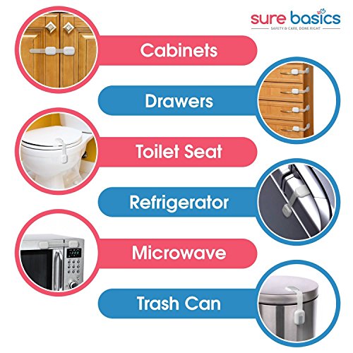 The Sure Basics childproofing baby cabinet locks is the reliable and trusted answer. Installed with strong industrial grade 3M adhesive, which means no drilling and no screws. You can secure any style cabinets, chest of drawers, refrigerators, microwave, oven, dishwasher, trash can, toilet seat lock, TV stand, windows, and more.