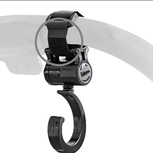 - マジックテープでベビーカーのハンドルに取り付けられるフック。360度回転で、たて方向にも取り付けできる