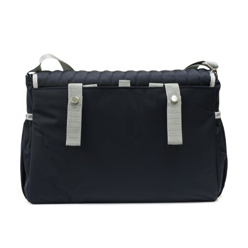 ARMANI BABYのロゴマザーバッグ(ファザーバッグ)。ママやパパに嬉しい、ベビーカーに付けられるストラップやいつ何処でもおむつ換えが出来るパッド等細かな気配り満点のバッグです。バッグは斜めがけが出来ますので両手が空いてラクラクです。
