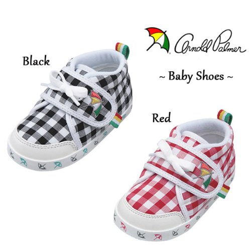 アーノルドパーマー(Arnold Palmer)の軽量ベビーシューズです。ギンガムチェックとリボンが可愛いシューズです。ベルクロタイプで履き口が大きく開き、履かせやすくなっています。