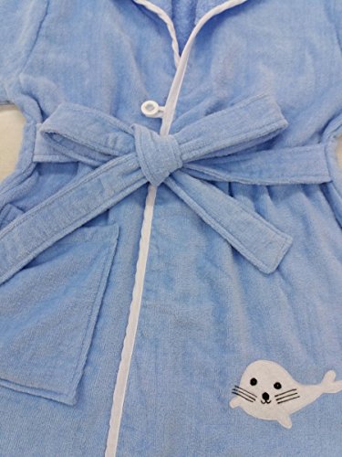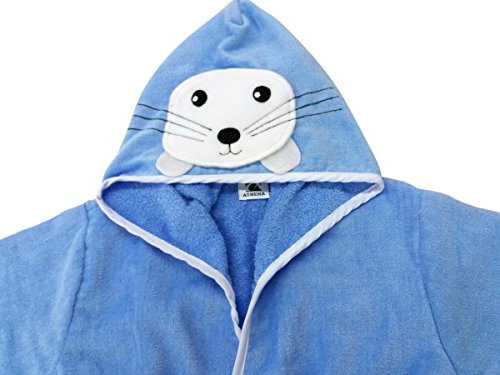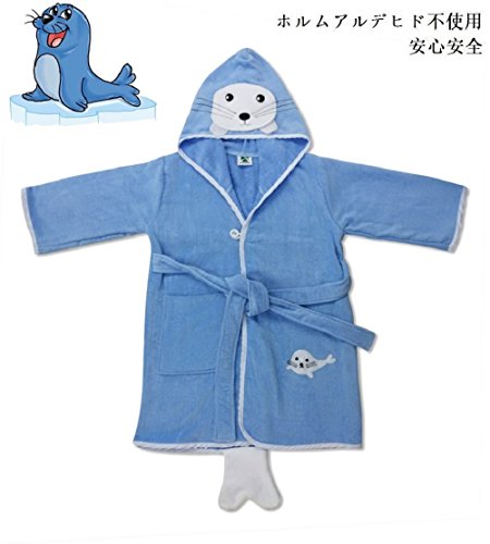 新年 ギフト アシカ君 子どもバスローブ フード、ベルト、ポケット付き ボダン留め ハシマ二頭検針 安心安全 タオル地 着心地良い 出産祝い 100%バージン綿 (100-120, 青)
