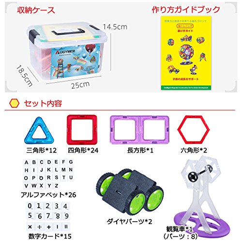- 【セット内容】:87pcsのセットには、12pcsの三角形、24pcsの正方形、26pcsのアルファベットプレート(非磁性)、15pcsの数字カード(非磁性)、1pcsの観覧車、2pcsの車輪。