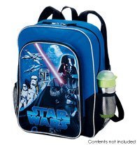16 inch x 12 inch x 5 inch nylon/poly backpack featuring the most popular Dark Side & Sith & Bounty Hunter Darth Vader Boba Fett Stormtroopers & The Death Star ! (water bottles shown in picture NOT included - to show use of pockets)