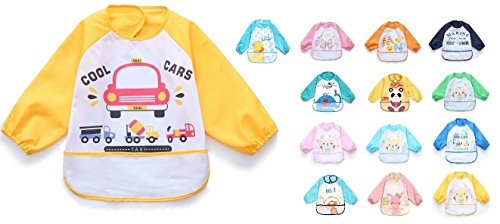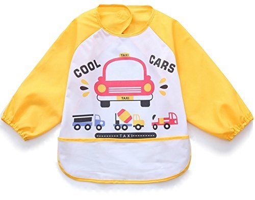 Adamz.sp 赤ちゃん 食事 エプロン 長袖 防水 食べこぼしポケット ビブ スタイ ガウン スモック 種類いっぱい (イエロー/クルマ)