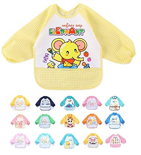赤ちゃん ベビー 食事 エプロン 長袖 防水 食べこぼしポケット ビブ スタイ ガウン スモック 種類いっぱい 男の子 女の子 黄色
