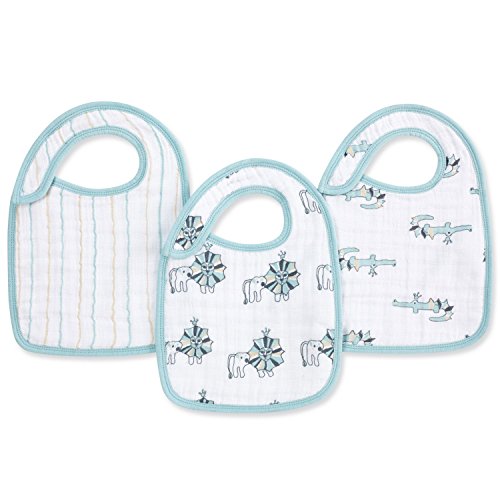 This Aden and Anais bib is made of a soft and plush fabric that is gentle on a baby's delicate skin.;Package includes 3 pre-washed baby bibs with snaps that adjust for easy and comfortable fastening.;Our Aden and Anais bibs and burp cloth baby accessories give full-coverage and helps protect the baby's clothing during messy mealtime.;Having your little one in mind, all Aden and Anais burpy bibs are designed with sweet and cheerful prints.;These muslin bibs with snaps are easy to put on, and are completely adorable.