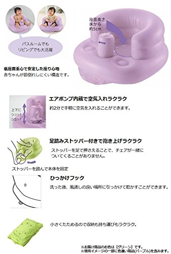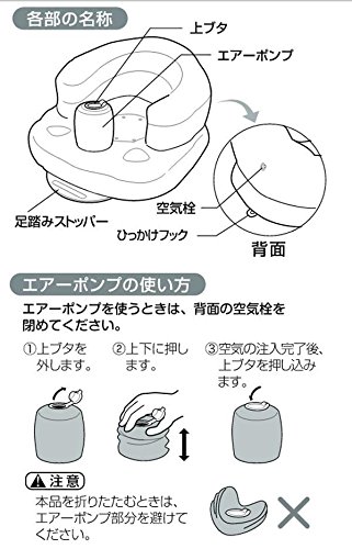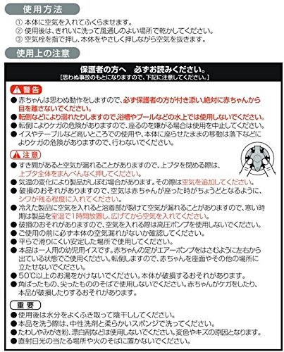 エアポンプ内蔵なので空気入れ不要!! 製造国:中国 素材・材質:本体・エアーポンプ・空気栓:塩化ビニル樹脂(食品衛生法対応可塑剤使用)空気弁:合成ゴム内部空気弁:ポリウレタン 商品サイズ:46×48×27H(cm)※空気量により多少異なる 重量:412g 仕様:対象月齢:7カ月~2歳頃まで適用体重:12kgまで 付属品:取扱説明書