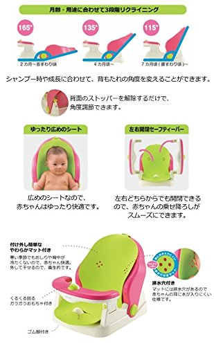 対象年齢2カ月頃~24カ月頃まで使用OK!!シャンプー時や成長に合わせて、背もたれの角度を変えることができます。