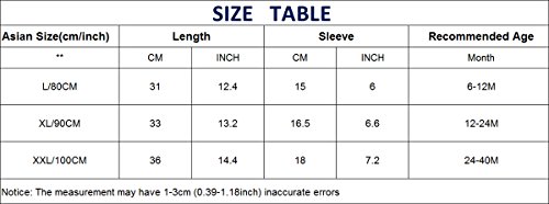 - L / 80 cm :長さ: 31 cm / 12.4インチ;袖長さ: 15 cm / 6インチ推奨年齢6 – 12 M。90 cm / XL長さ33 cm / 13.2インチ;袖長さ:約16.5 cm / 6.6インチ推奨年齢12 – 24 M。XXL / 100 cm :長さ: 36 cm / 14.4インチ;袖長さ: 18 cm / 7.2インチ;推奨年齢: 24 – 40 M