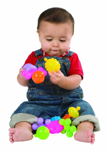 Babys first construction set. Snap, pop, twist and pull. Unique connector tool. 26 pieces - 8 shapes in 6 bright colors.