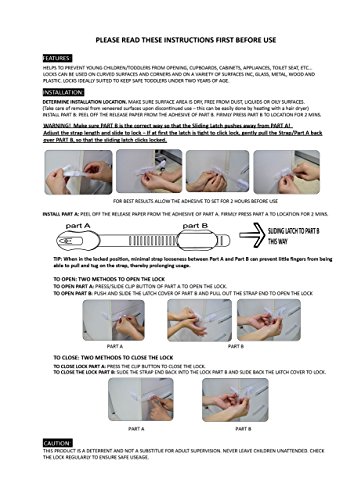 - SIMPLE & EASY TO INSTALL, USE & REMOVE: No drilling or screw is needed to install the locks for childproofing your house. Open or close the latch with a single hand by adults! However it is challenging for infants and toddlers to open. TEN EXTRA PIECES OF ADHESIVES to use if you want to change the locks to different positions. You can reuse your locks without buying new products! Follow the instructions to ensure best performance.