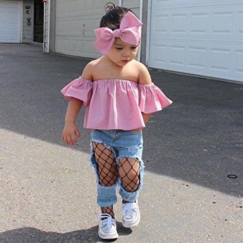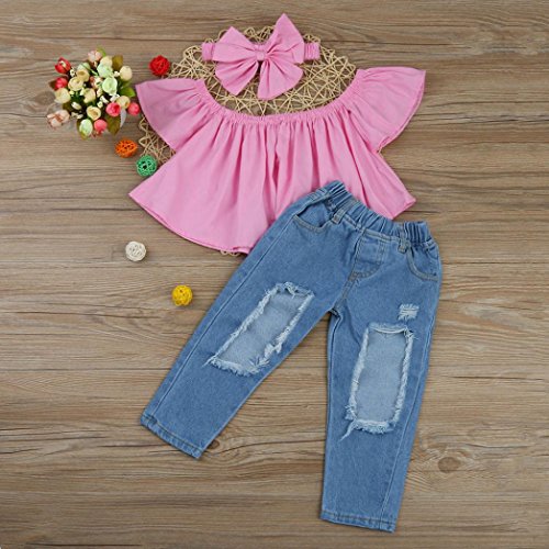 Aliciga 子供服 女の子 デニム オフショルダー 蝶結び 無地 パフ袖 ボートネックTシャツ+穴あるジーンズ+ヘッドバンド 上下セット ルース スカラップ ヘッドバンド リボン かわいい 春夏 ファション (90, ピンク)