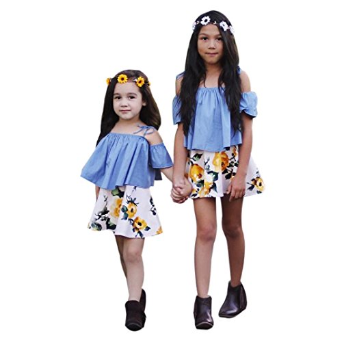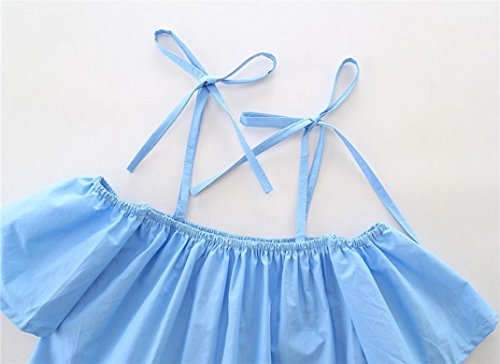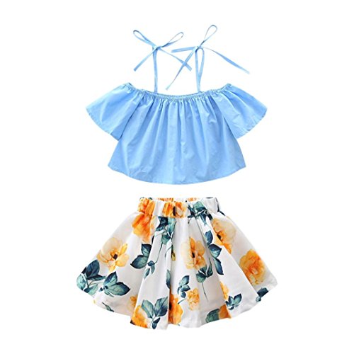 Aliciga 子供服 女の子 無地 オフショルダー スリング シャツ 花柄 プリーツスカート 半袖 ボートネックシャツ+スカート 上下セット ルース かわいい 春夏 ファション (90, ブルー)