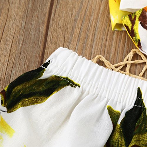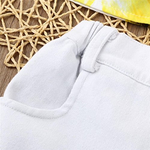 Aliciga 子供服 女の子 上下セット ノースリーブ 肩出し ベアトップ 果物のプリント ボートネックTシャツ+穴あるジーンズ+ヘッドバンド ルース リボン へそ出しルック かわいい トップス ファッション タッセル デニムパンツ 春夏 旅行 夏休み 海 トラベル (90, イエロー)