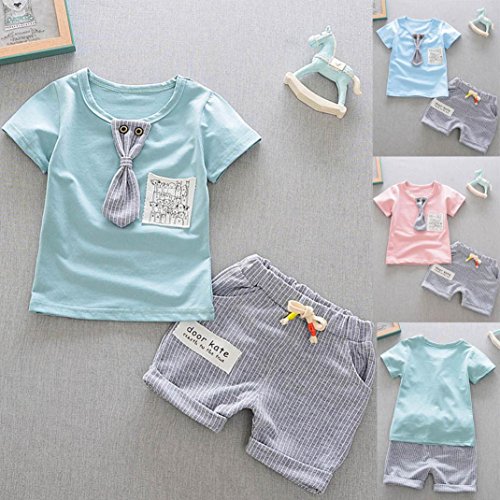 Aliciga ベビー服 セットアップ 男の子 半袖 Tシャツ + パンツ 二点セット 子供服 ネクタイ ストライプ プリント カッコイイ ファッション 人気 カットソ ダンス衣装 スポーツ 発表会 保育園 普段着 部屋着 運動会 イベント (100, ブルー)