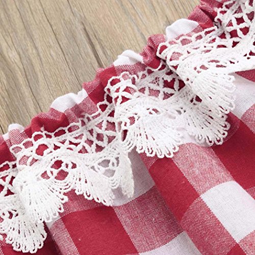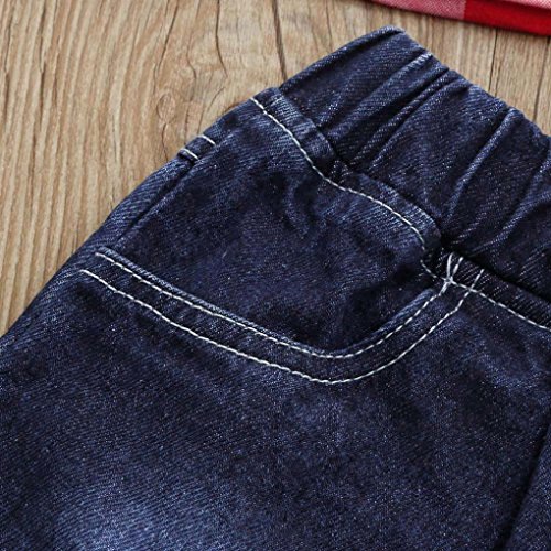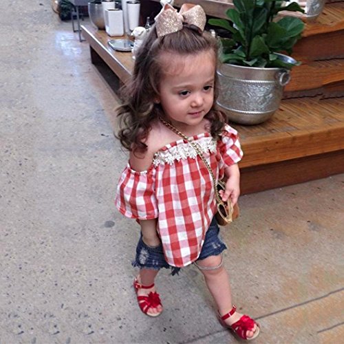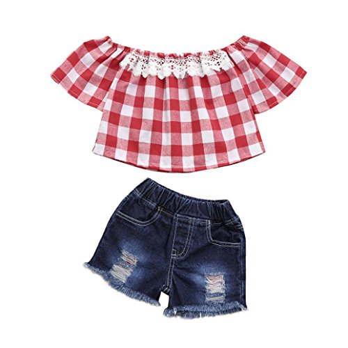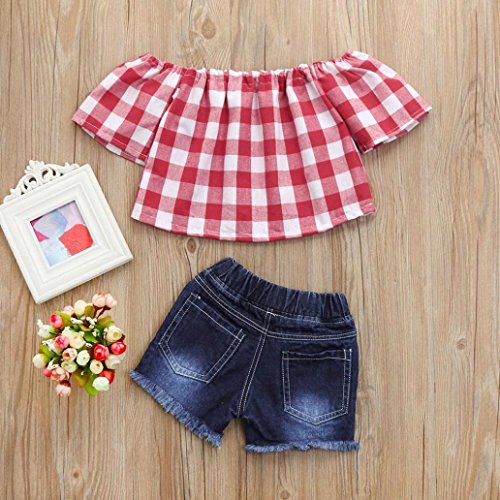 Aliciga 子供服 女の子 セットアップ 半袖 肩出し トップス + ジーンズ 2点セット ベビー服 デニム ショートパンツ チェック柄 新生児 肌着 かわいい 夏 ファッション 人気 通園 通学 0~4歳 (80 (日本より1~2サイズ小さい), レッド)
