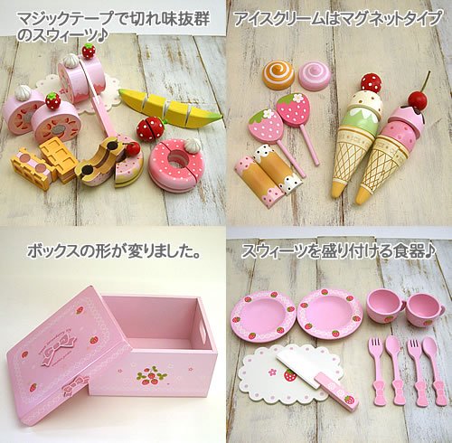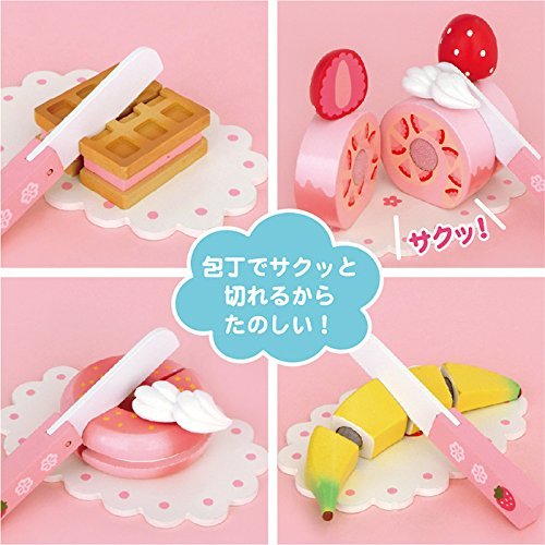 - ケーキやフルーツをカットしたり、ピックでデコレーションしたりできます。ケーキ風のとっても可愛い木箱に入っています