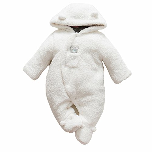 ベビーロンパース クマ 着ぐるみ カバーオール ベビー 防寒着 ボア モコモコ 前開き コスチューム フード付き 新生児 コットン (ホワイト, 73)